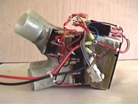 The two lower heater ducts are directed to the feet, while the top two go to the face level eyeball vents, unless these are closed in which case the flow is diverted to the windshield. |  |      |  | The temporary wiring in the photos is automotive and will be replaced for the final version.