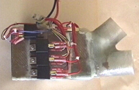 The ceramic heating element carriers were trimmed to minimize the width and height of each unit and to just provide enough electrical insulation between adjacent units. Each heater unit consists of a continuous resistive element with a spade terminal at the physical mid point and one at each end. I connected the center terminal to -ve and the two outer terminals to +ve. This generates about 200-250 Watts of heat for each element.