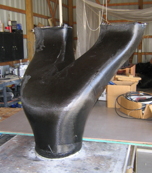 After cure this was followed by more micro and then epoxy primer, topcoat paint, hand polishing, and then several coats of mold release. The final product is a polished plug onto which is laid up three plies of carbon BID to make the shell of the duct. The inside surface of the duct is in this way made mirror smooth. To remove the duct shell from the plug, it is cut along three seams where flanges are added, and nut-plates installed at close intervals. This way we can open up the duct at any time and install internal guide vanes and VGs while we make the inevitable modifications to get the airflow right.