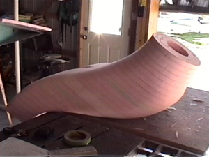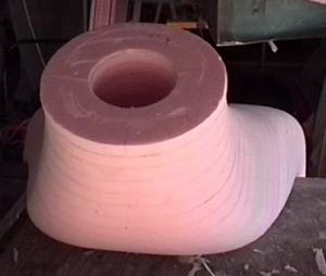 Thin aluminum sheet templates were used to cut one-inch foam sheet sections, which were then assembled to produce a rough plug. This was sanded and filled with micro before the application of two plies of BID for the duct shell.